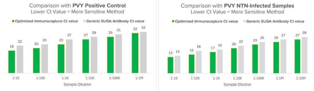 Although qPCR methods for detection of PVY are highly sensitive and specific, the labor and extraction kit materials required for traditional nucleic acid purification can be cost-prohibitive for certification purposes. Traditional nucleic acid purification materials and reagents can be costly and require multiple steps, each of which is a critical control point that can be subject to errors. Immunocapture simplifies this process by combining pathogen isolation and nucleic acid preparation into a single step.
