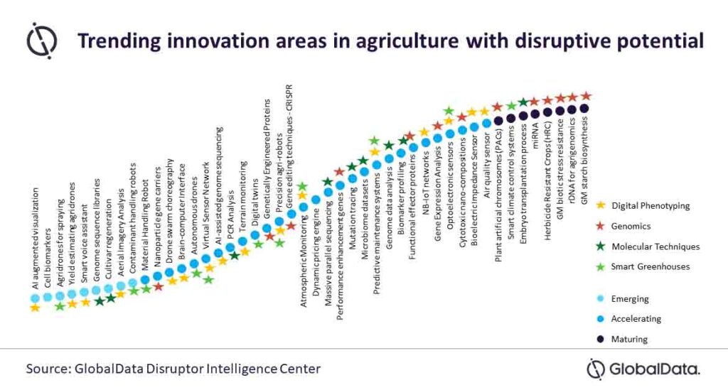 Vaibhav Gundre, Senior Consultant at GlobalData, comments: “Exploring new varieties and discovering novel genetic features using innovative agricultural concepts are seen as a growing trend. The combination of technologies such as sensors, computer vision, AI, and human-machine interface enables the prediction of crop yield and performance as well as performing weed and pest control processes.”