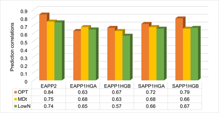 Currently, in CIMMYT’s eastern and southern breeding pipelines, all product profiles are using genomic selection at stage I, where the training population is evaluated in multiple locations with a sparse design, estimating the GEBVs for the unphenotyped lines, and using GEBVs and phenotypic BLUPs of test crosses in the selection for stage II. This process allows the handling of a large number of lines at stage I with a fixed budget without losing selection accuracy. Since 2017, we have used the “test half and predict half” strategy (Figure 2), where all the lines were genotyped with mid-density markers, and the selected ~50% of the total stage I lines were testcrossed and evaluated in multiple locations to be used as a training population to estimate the GEBVs for the other 50% of the unphenotyped lines for the traits of interest. High prediction correlations were observed in three selected product profiles for GY under optimum, managed drought, and low soil N conditions (Figure 3).