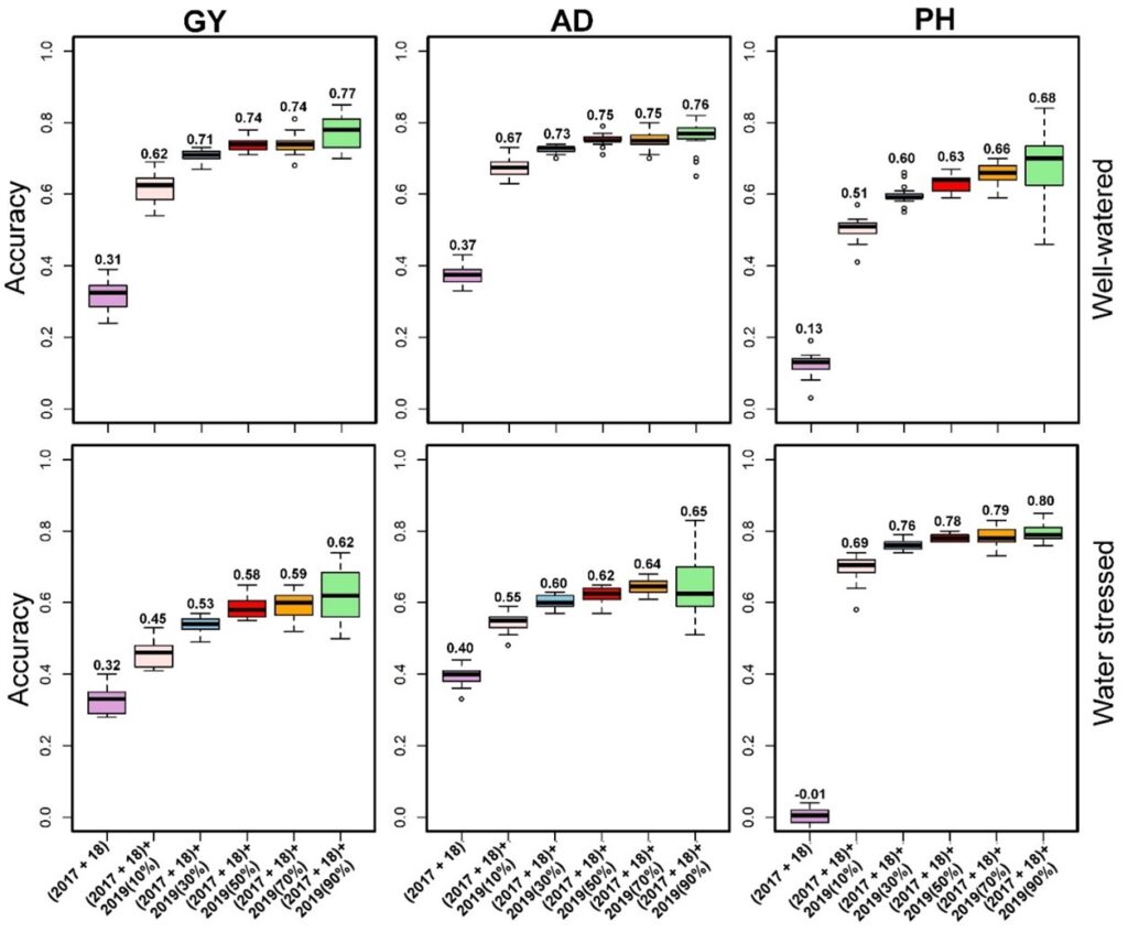 Genomic selection is also implemented to reduce the breeding cycle. However, our final products are three-way cross hybrids, where genomic selection is applied only to select the best line rather than selecting the best hybrid combinations. Historical data were used to test the possibility of reducing the breeding cycle. However, our results showed that the use of historical data to predict 100% of lines from the current year yielded low to moderate prediction correlations both under optimum and drought conditions for GY, anthesis date, and plant height (Figure 4). Incorporating 10 to 30% of the testing population into the training population leads to high prediction correlations. This concludes that by using historical data, the training population, which needs to be test-crossed and evaluated in multiple locations every year, can be reduced from 50% to 10-30%, which helps breeders allocate the saved resources to evaluate more lines without losing prediction accuracy.