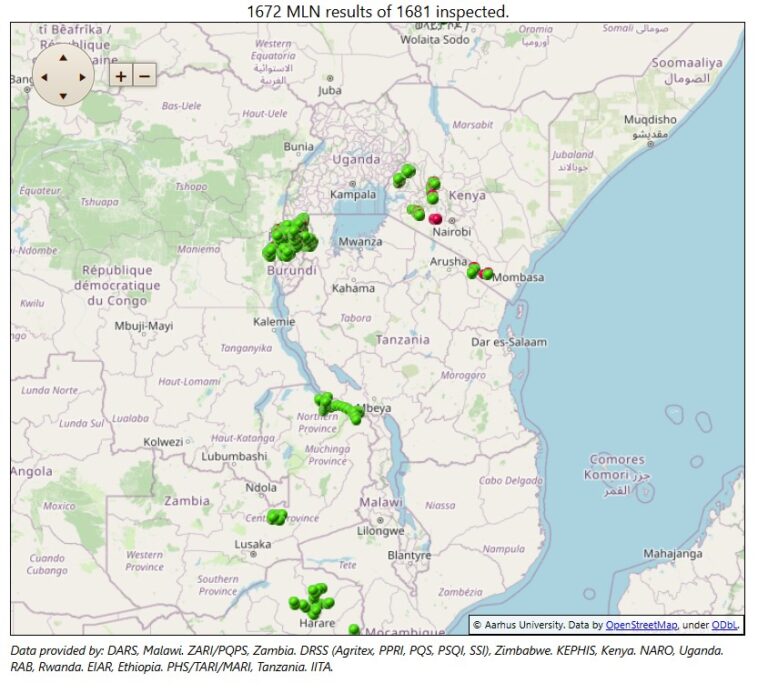 Africa’s first turning point came with the decision to fight MLN through data, diagnostics, and coordination. CIMMYT, NPPOs, and national partners built a surveillance network spanning eight countries (Kenya, Tanzania, Ethiopia, Uganda, Rwanda, Malawi, Zambia and Zimbabwe), powered by rapid immunostrip testing and GPS-linked ODK mobile tools. More than 19,000 diagnostic datapoints (mln.cimmyt.org) uploaded into the system, reaching a real-time alert that helped governments act before outbreaks spread.