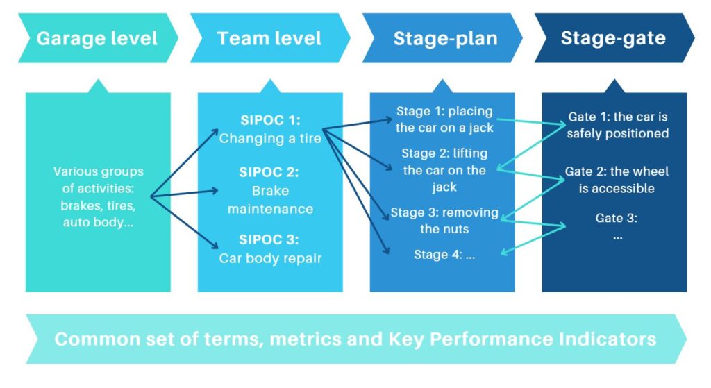 In a garage, there are distinct groups of services that can be performed by specialized mechanics, such as tire replacement, car body repair, or brake maintenance. These groups of services all require a set of processes – which can be described by a SIPOC.