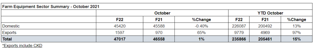 01 November 2021, Mumbai: Mahindra & Mahindra Ltd.’s Farm Equipment Sector (FES), part of the Mahindra Group, today announced its tractor sales numbers for October 2021. Domestic sales in October 2021 were at 45420 units, as against 45588 units during October 2020. Total tractor sales (Domestic + Exports) during October 2021 were at 47017 units, as against 46558 units for the same period last year. Exports for the month stood at 1597 units.