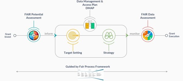 The figure below illustrates the framework created for implementing FAIR data practices within grant investments, from initial investment to execution. It begins with a FAIR Potential Assessment to evaluate the data’s potential to meet FAIR standards, followed by the creation of a Data Management & Access Plan (DMAP) that guides target setting and strategy development for data management.
