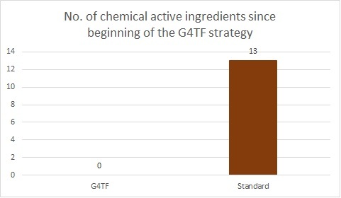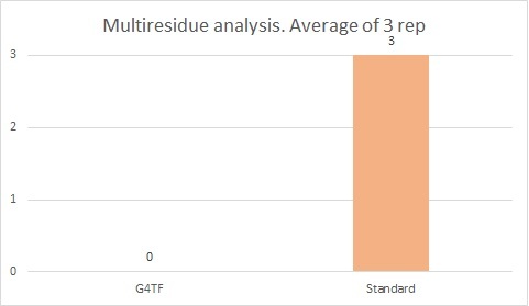 The average of three multi-residue analyses shows a 100% reduction in the G4TF vs the Standard plot: no chemical substance residue appears in the G4TF protocol while 3 active substances appear in the standard, although all of them are below 50 % of the established MRL.