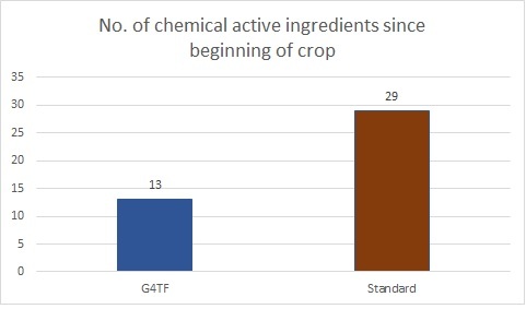 Analysis of the reduction in the number of synthetic or chemical substances used in the protocol compared to the farmer’s standard is also a Key Performance Indicator (KPI) of the G4TF project. The graph shows a reduction in the use of chemicals of 55% from the transplant of the crop (when there was use of some chemicals), and a 100% reduction from the start of the Certis Belchim Biorationals program.