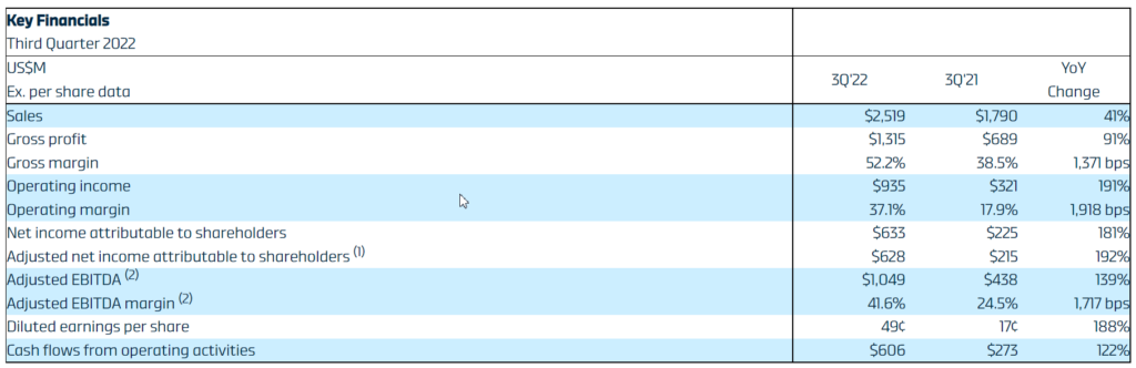 10 November 2022, Israel: ICL (NYSE: ICL) (TASE: ICL) , a leading global specialty minerals company, today reported its financial results for the third quarter ended September 30, 2022. Consolidated sales of $2,519 million were up 41% year-over-year versus $1,790 million. Operating income of $935 million was up 191% versus $321 million, while adjusted operating income of $928 million was up 195% versus $315 million. Net income of $633 million was up 181%, while adjusted net income of $628 million was up 192%. Adjusted EBITDA of $1,049 million was up 139% versus $438 million. Adjusted EBITDA margin of 41.6% was up versus 24.5%. Earnings per share of $0.49 were up 188% versus $0.17.