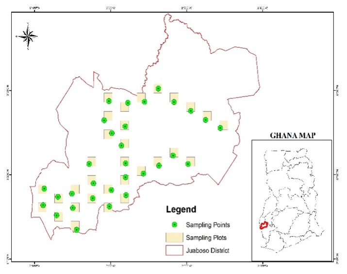 (Left) Map of sampling plots distributed within Juaboso District and (right) a view of a sampling point collecting soils for use in the soil health analysis.