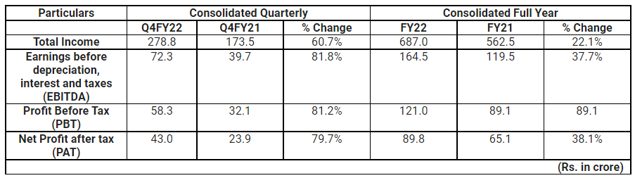 Q4 FY22 consolidated total income increased by 60.7% year-on-year, EBITDA grew by 81.8% year-on-year, EBITDA margin improved by 345bps and Profit after tax grew by 79.7% year-on-year