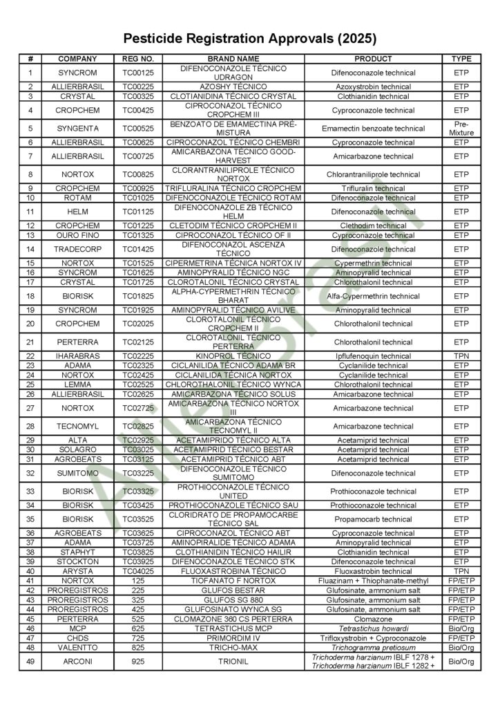 The compilation was prepared by AllierBrasil, a consulting firm specialising in product registration and regulatory affairs. The data is based on official acts issued by the Ministry of Agriculture and Livestock, as published in the Official Gazette of Brazil.