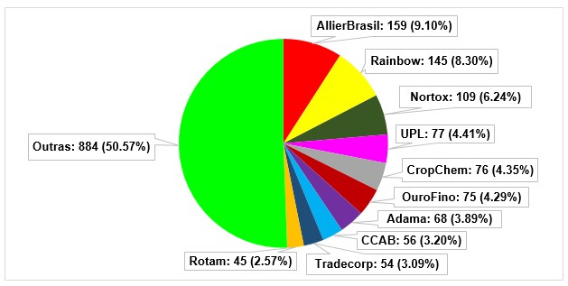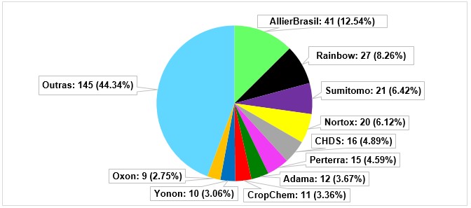 Despite the large number of registrant companies, only 10 of them were granted with 49.43% of approvals in this product category over the last 15 years. Among these, the registration consulting firm AllierBrasil stands out with 9.1% of total approvals. Considering it is a registration consultancy, the company does not use registration to access the market. After approvals, registrations are generally transferred to the contractors or their agents, such as ADM, CHDS, Dinagro, Hailir, Max (Rudong), Solus, Wynca, among others, which will sell such products directly or through third parties.