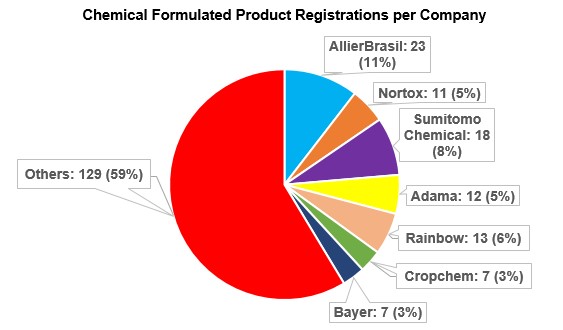 Compared to the 2023 data, practically the same companies hold the highest number of registration approvals for chemical formulated products, with the exception of Sumitomo Chemical and Bayer.
