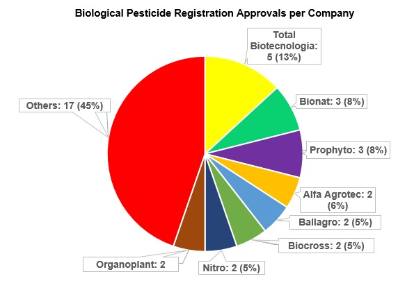 Seven companies accounted for 36% of approved registrations, with AllierBrasil standing out with 9% of approvals (23), Sumitomo Chemical, 7% (19), Rainbow, 5% (13) and Adama, 5% (12).