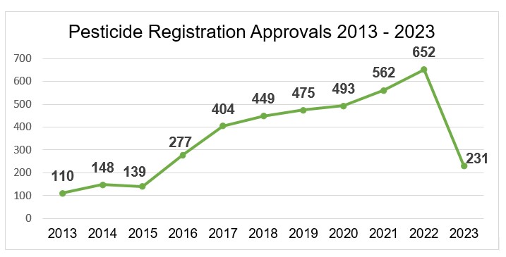 On the other hand, since 2017, regulatory agencies increased considerably the number of registration approvals. Even so, the submissions of the chemical formulated products that were last approved were applied in 2016 and 2017. This means that the time for approval of a chemical formulated product takes six to seven years, and this comes only after the approval of the technical product because the formulated product is only eligible for evaluation after its technical product is approved.