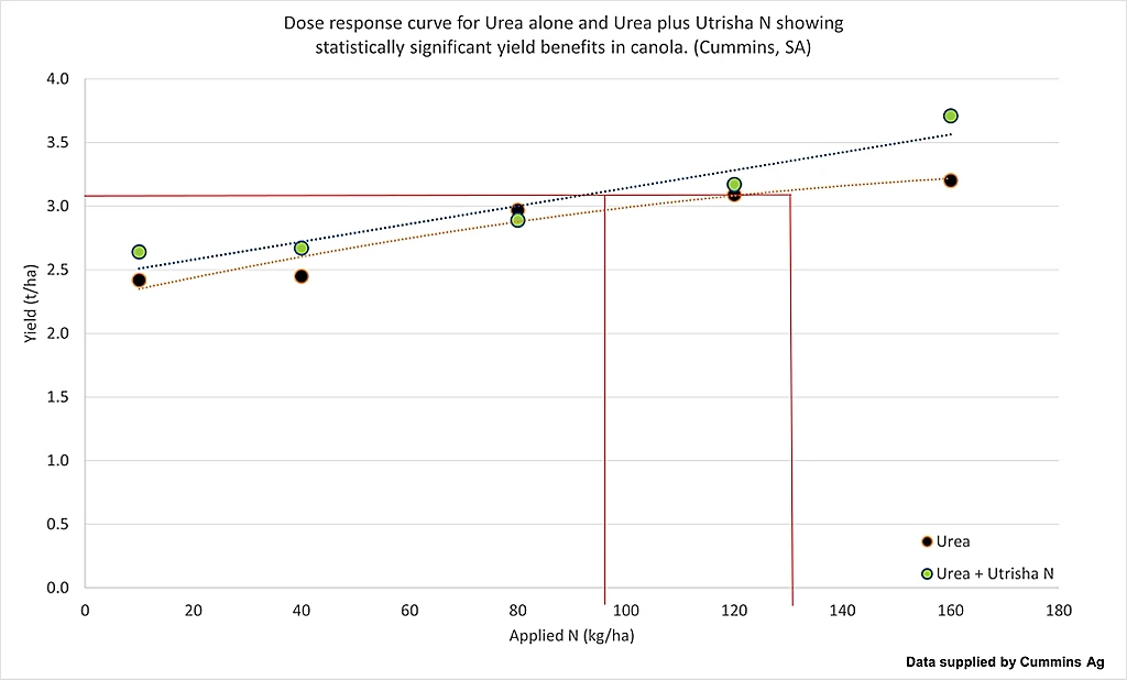 In a small plot replicated wheat trial conducted by Cummins Ag in South Australia, equivalent rates of urea plus or minus Utrisha® N applied at tillering were compared to develop a yield response curve. This curve (Image 1) shows a contribution from Utrisha® N equivalent to approximately 30 kilograms of nitrogen per hectare. A similar result was seen with the work conducted by Cummins Ag in canola. (Image 2)