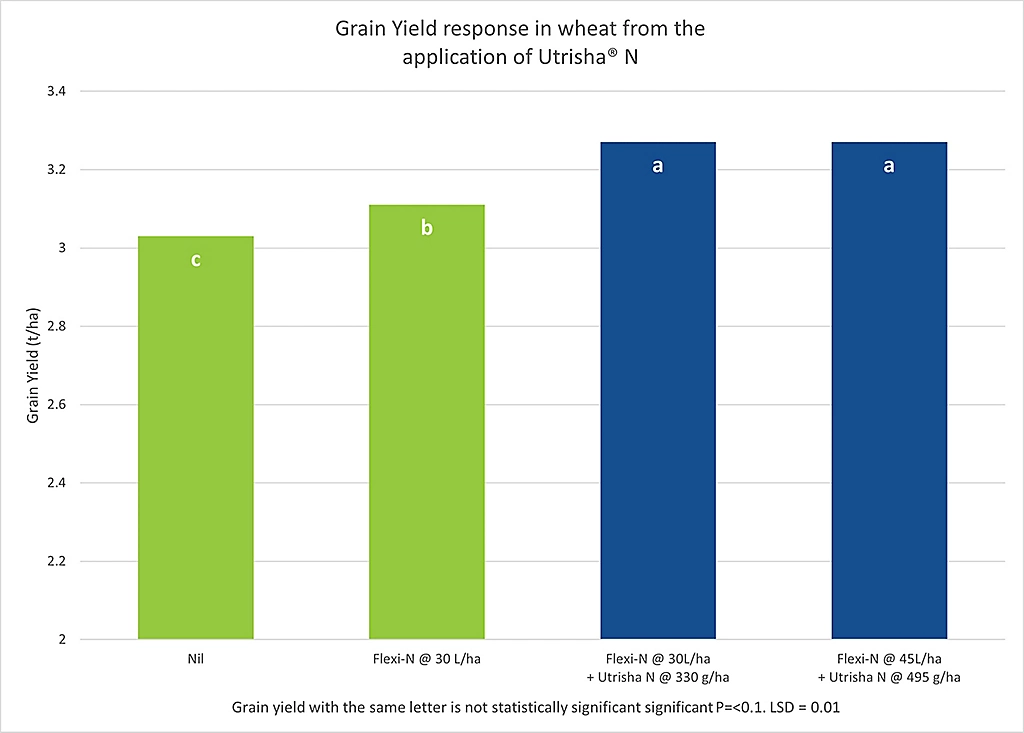 A field-scale trial in Calingiri, WA, was conducted to determine if using Utrisha® N in conjunction with Flexi-N® increased grain yield in wheat. All treatments, including the Nil plots had an application of 70L/ha of Flexi-N as a base treatment. Treatments were applied as a top-dressing at GS32 growth stage of wheat.