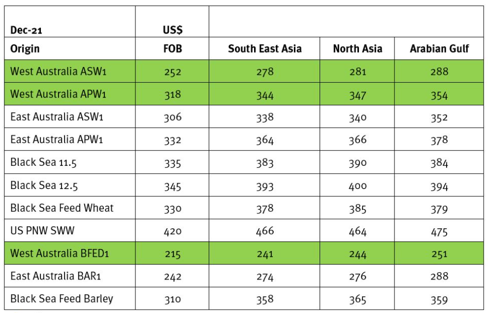 The table shows indicative wheat and barley values based on best published bids to growers this week plus fobbing costs and exchange rate conversion to provide a US$ Free on Board (FOB) price basis ex Western Australia and Eastern Australia and our major competitor origins of Black Sea and US Pacific Northwest.