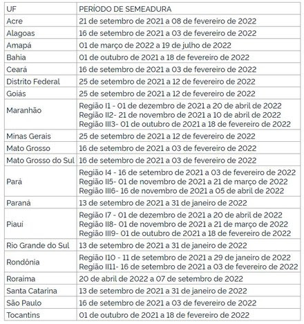Sowing, which, until now, was established only in the states of Bahia, Goiás, Mato Grosso, Mato Grosso do Sul, Santa Catarina and Tocantins, is also mandatory, from this harvest, in the states of Acre, Alagoas, Amapá, Ceará, Federal District, Maranhão, Minas Gerais, Pará, Paraná, Piauí, Rio Grande do Sul, Rondônia, Roraima and São Paulo, totaling 20 states with a period determined for the beginning and end of planting.