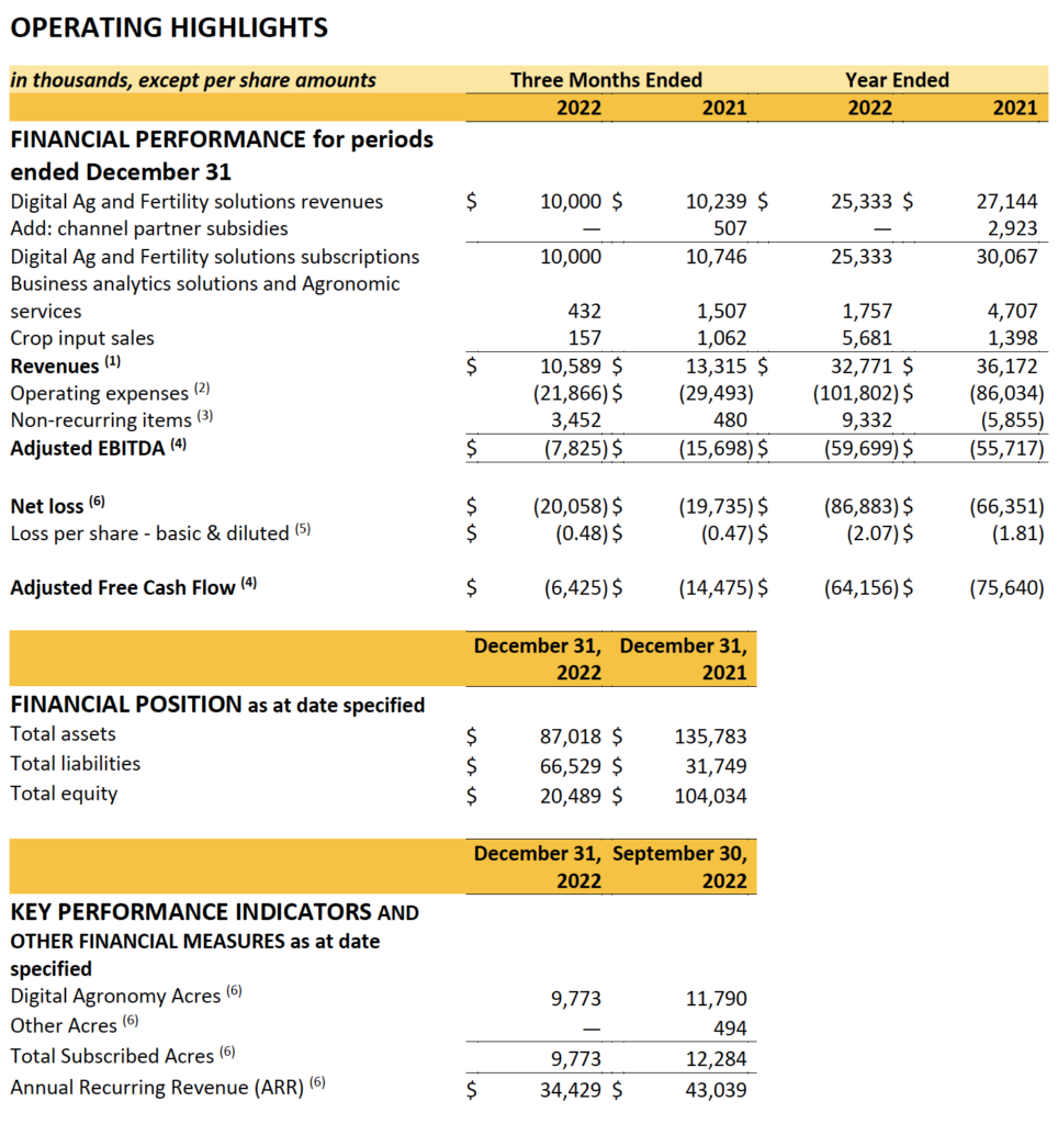 - Revenues for the three months and year ended December 31, 2022 (excluding partner subsidies in 2021) were slightly lower than the comparable periods in 2021. Sales in 2022 for both periods had no subsidies. Lower digital agronomy revenues were due to the lower digital agronomy acres during the year. This was partially offset by a higher revenue per acre as most of the lost acres were non-paying PGP or low-value discontinued acres. Lower fertility revenue in Q1 2022 of $1.0 million due to a higher soil test completion rate in Q4 2021 also impacted the year-to-date results. In Q4 2022, crop input e-commerce sales were lower due to a supply-demand mismatch caused by weaker market demand and an oversupply of products. Management expects e-commerce sales to start to rebound in Q1 2023 and plans to enhance its retail marketplace by broadening its offerings through a new platform.