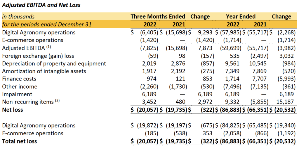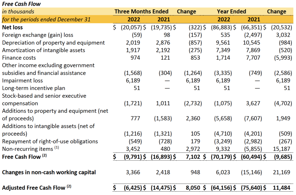- The Adjusted EBITDA loss for the fourth quarter of 2022 was $7.8 million (2021 – $15.7 million) and $59.7 million for the year ended December 31, 2022 (2021 – $55.7 million). The positive improvement in Q4 2022 was primarily the result of cost savings initiatives.