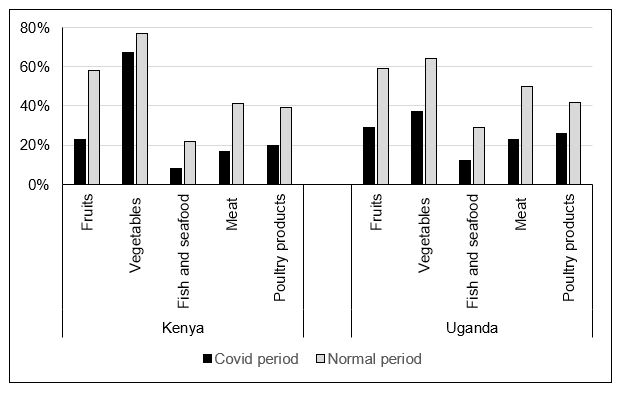 Except for vegetables in Kenya, the number of respondents who regularly consumed each of the five food groups – fruits, vegetables, fish and seafood, meat and poultry – reduced by about 50 percentage points during the pandemic.