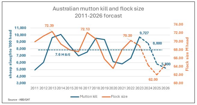 It should be noted that the mutton kill is made up of ewes with hardly any wethers being retained. Hence, a heavy mutton kill reflects a heavy female sheep kill and liquidation, and a low mutton kill reflects ewe retention and a rebuilding process.