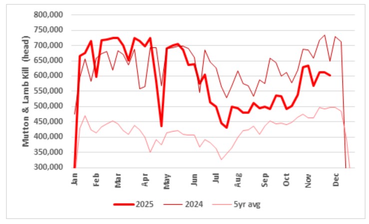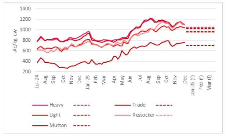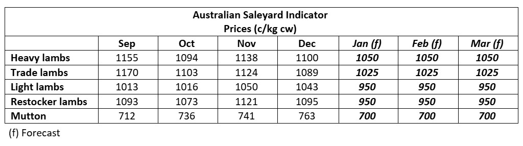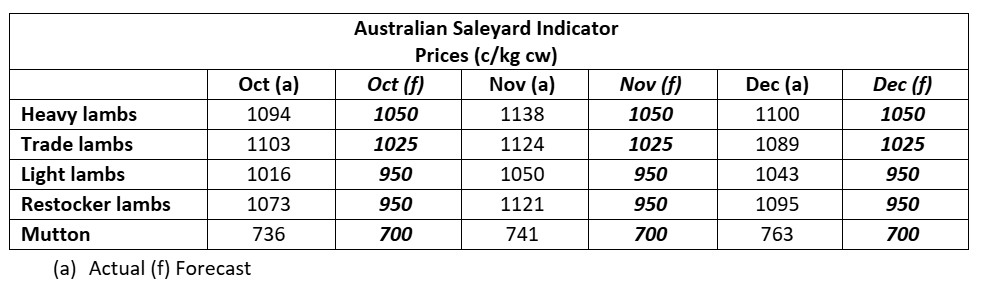 Prices into the end of the year may be affected by quality with yardings compromising a greater proportion of dry and woolly lambs from western and northern lambing areas that are showing the effects of the season, lacking weight and finish. This might be the order of the day for December with spreads between light and heavier lambs increasing until supplies out of feedlots ramp up in Q1 2026.