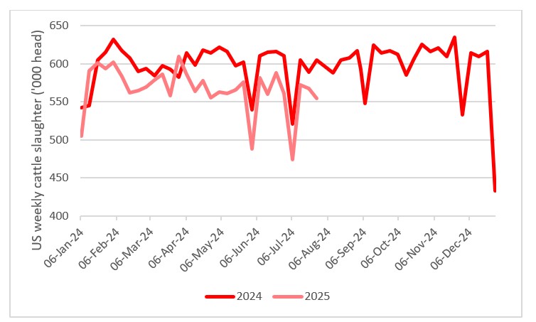Cattle values consolidated at recent highs as processors raise concerns that margins are being squeezed by the recent lift in rates. The good news is that US domestic beef prices continue to rise and exporters are currently in negotiations for new contracts on the basis of Brazilian lean beef being excluded from the US market. The outcome of these negotiations could set the scene for further rises in export beef values which would help restore processing margins and create room for a further lift in local cattle values. Certainly, the US market needs our beef with a sharp fall in US slaughter and production pushing US domestic beef values higher. The US choice cut-out (wholesale value of US feedlot cattle) is currently $406/cwt vs $315/cwt last year (+29 pc).