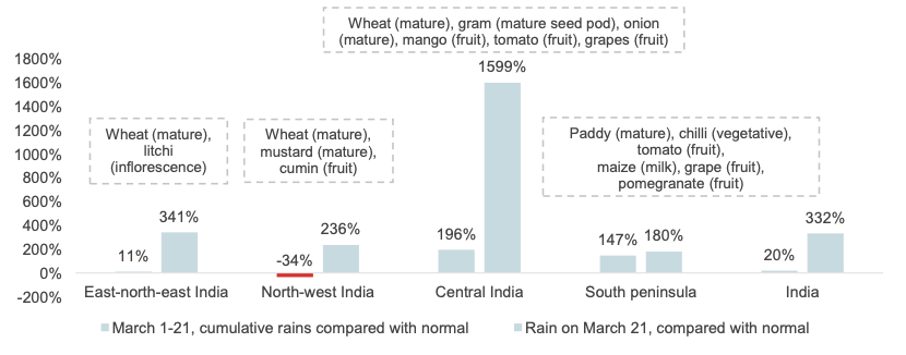In the north and northeast, rains have been beneficial for vegetables and mango, but in Bihar, it has damaged wheat and litchi crops. Litchi orchards were in full bloom and excess rains have led to a significant decline in flowering, which is expected to reduce yields by 5-6% on-year. In wheat, lodging has been reported in many places, which would impact yield.