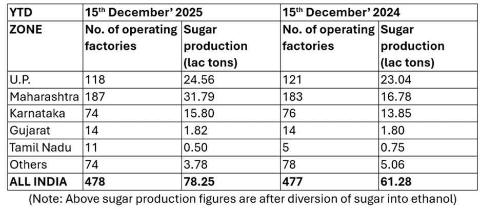 As on December 15, 2025, all-India sugar production stood at 78.25 lakh tonnes, registering a healthy growth of about 28 per cent over the 61.28 lakh tonnes produced during the corresponding period last year. The number of sugar mills in operation has also seen a marginal increase, with 478 mills currently crushing cane compared to 477 mills at the same time in the previous season.