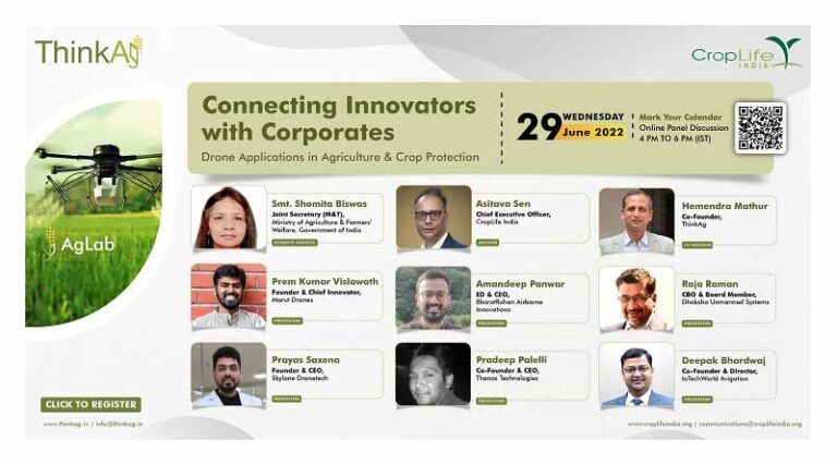 30 June 2022, New Delhi: ThinkAg along with CropLife India, the leading voice of the plant science industry in India organized an Industry Round table “AgLab” – Connecting Innovators with Corporates – Drone Applications in Agriculture & Crop Protection – bringing together all stakeholders of the Agriculture Drone ecosystem with a ‘focused platform for partnerships’ for the start-ups and stressed on the need of fast tracking and large scale adoption of drone technology for agrochemical spraying in the country.