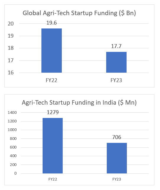 As per a report by FSG, a global nonprofit consulting firm, “India’s agri-tech sector witnessed an investment boom in FY22, its most successful year attracting venture capital funding, with investments totaling US$ 1,279 million. This surge was followed by a sharp contraction in FY23, a trend aligned with the broader global slump in agri-tech investments. Between FY22 and FY23, investments in Indian agri-tech fell by a staggering 45% to US$ 706 million, while global agri-tech investments saw a decline of 10% from US$ 19.6 billion to US$ 17.7 billion between calendar years 2022 and 2023”.