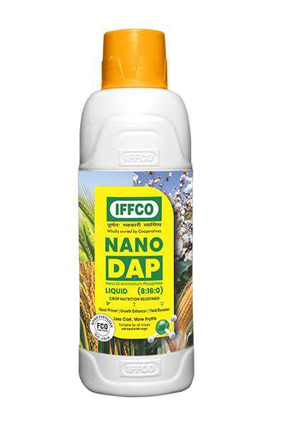 Nano DAP Liquid is an efficient source of Nitrogen & Phosphorus and helps in overcoming Nitrogen & Phosphorus deficiencies in plants. The Nano Di-ammonium Phosphate (DAP) liquid fertilizer developed by the Indian Farmers Fertiliser Cooperative (IFFCO), the country’s largest fertilizer cooperative, has been notified by the Ministry of Agriculture and Farmers Welfare under the Fertilizer Control Order on March 2, 2023, and a gazette notification was issued allowing IFFCO to produce Nano DAP liquid in India. It is biologically safe & Eco- friendly, fit for residue-free green farming.