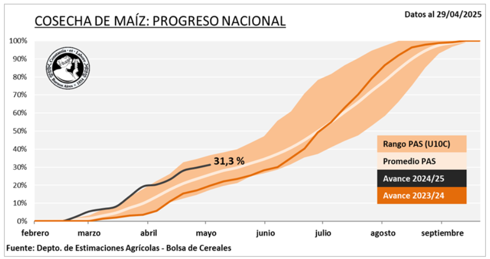 Below is the 2024/2025 Argentina corn harvest pace for April 30, 2025 from the Buenos Aires Grain Exchange.