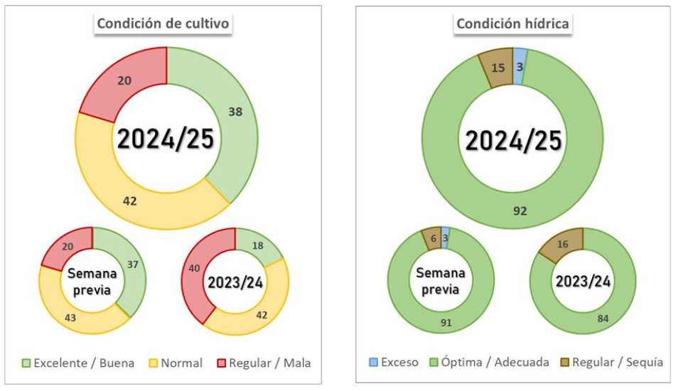 The 2024/2025 Argentina corn was rated 20% poor to very poor, 42% fair, and 38% good to excellent. The good to excellent percentage was up one point compared to the prior week. Soil moisture for corn was rated 15% short to very short, and 92% favorable/optimum. The favorable to optimum was up one percentage point from the prior week.