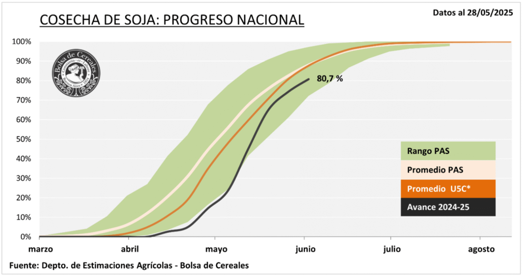 Below is the soybean harvest progress in Argentina from May 28, 2025 from the Buenos Aires Grain Exchange.