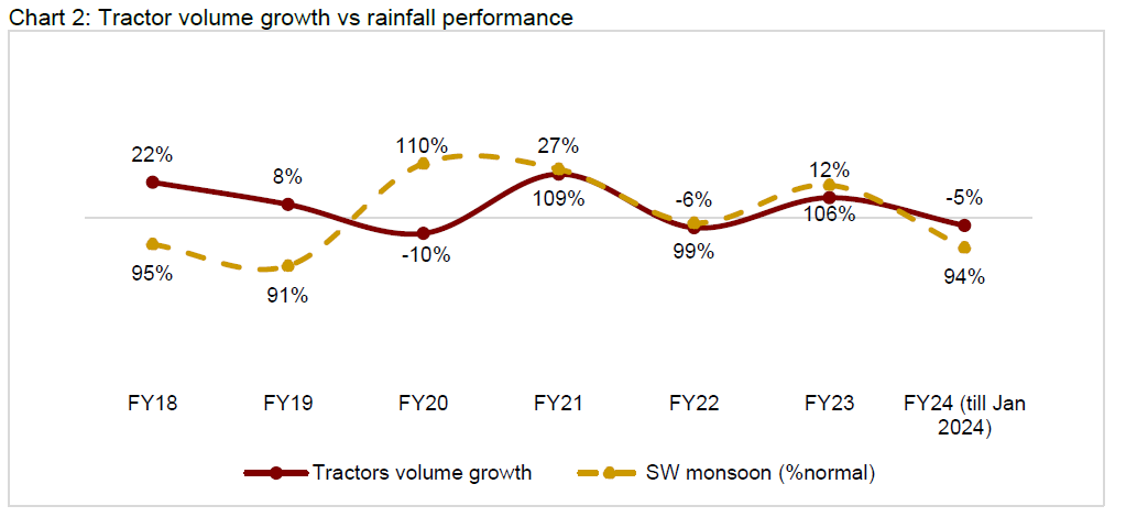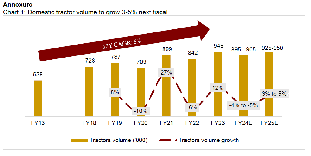 Successive years of normal monsoon over fiscals 2021-23 have led to positive rural income, resulting in a compound annual growth rate (CAGR) of 10% in tractor sales against the long-term average growth rate of 6% in the past decade. Tractor sales peaked at ~945,300 units in fiscal 2023 (refer to chart 1 in annexure).